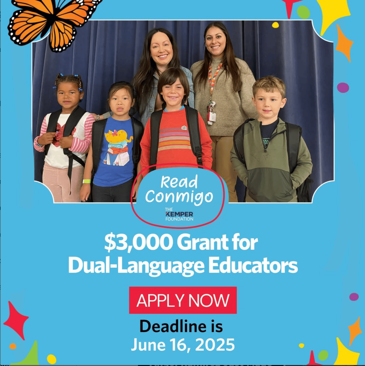 The application period for the fall 2025 Read Conmigo Educator Grants is now open. Applications are due by June 16, 2025 at 11:59 p.m. local time. Grant awardees will receive $3000.00 to support their dual language immersion classroom. Click the button below for qualifications and the online application.